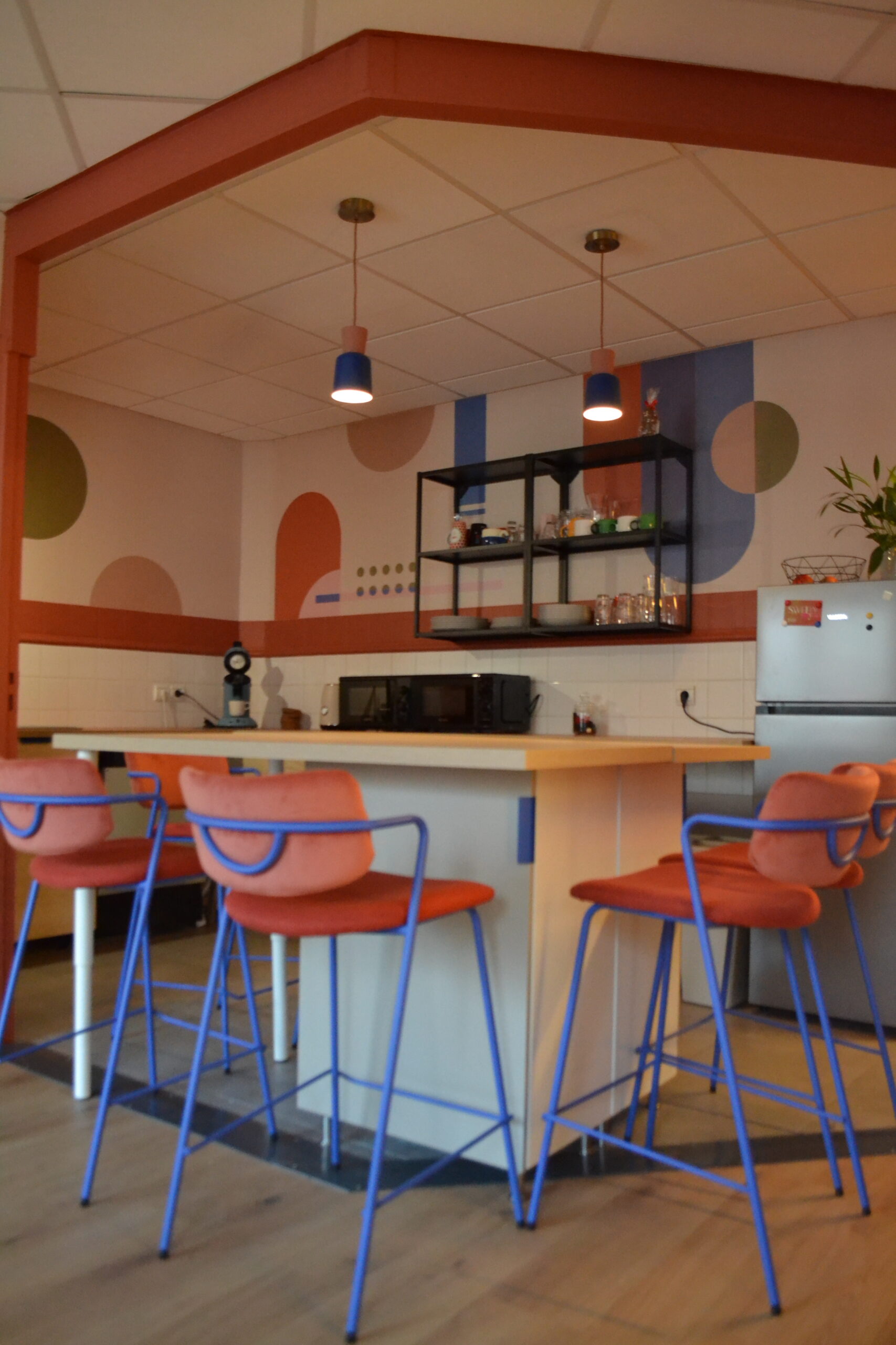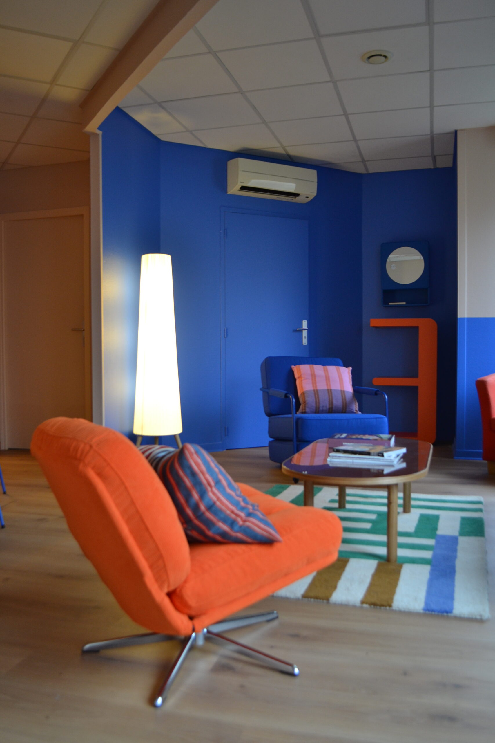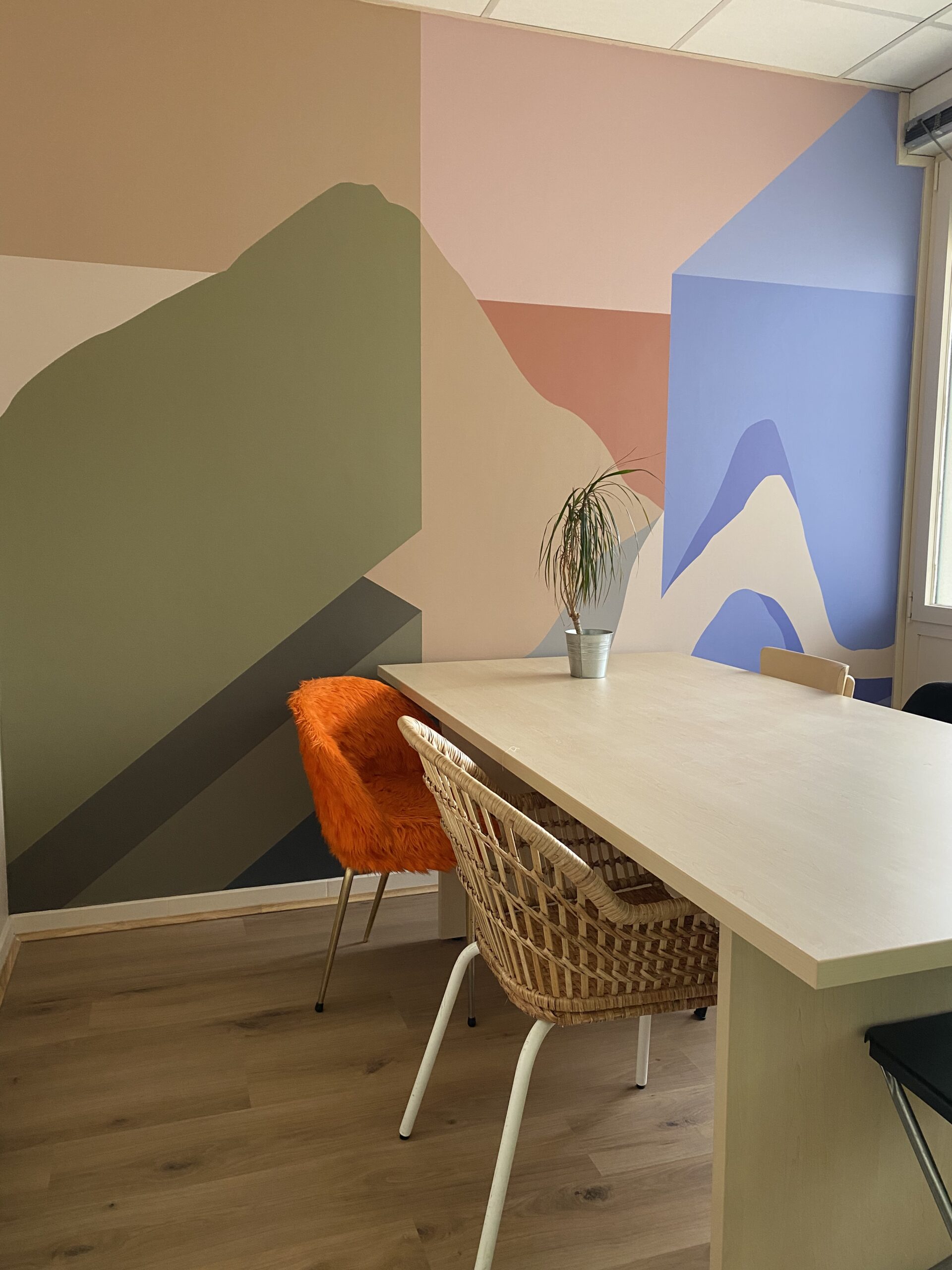Nous avions envie de créer une agence qui nous ressemble, qui présente nos différentes compétences telles que l’aménagement intérieur, la signalétique et le graphisme. Pour cela, nous avons pensé un lieu chaleureux où la couleur est présente comme un message dynamique. Chaque élément a été pensé pour créer un espace harmonieux : de la couleur au choix du mobilier, en passant par le design de nos tapisseries sur-mesure avec des formes géométriques, rien n’a été laissé au hasard !