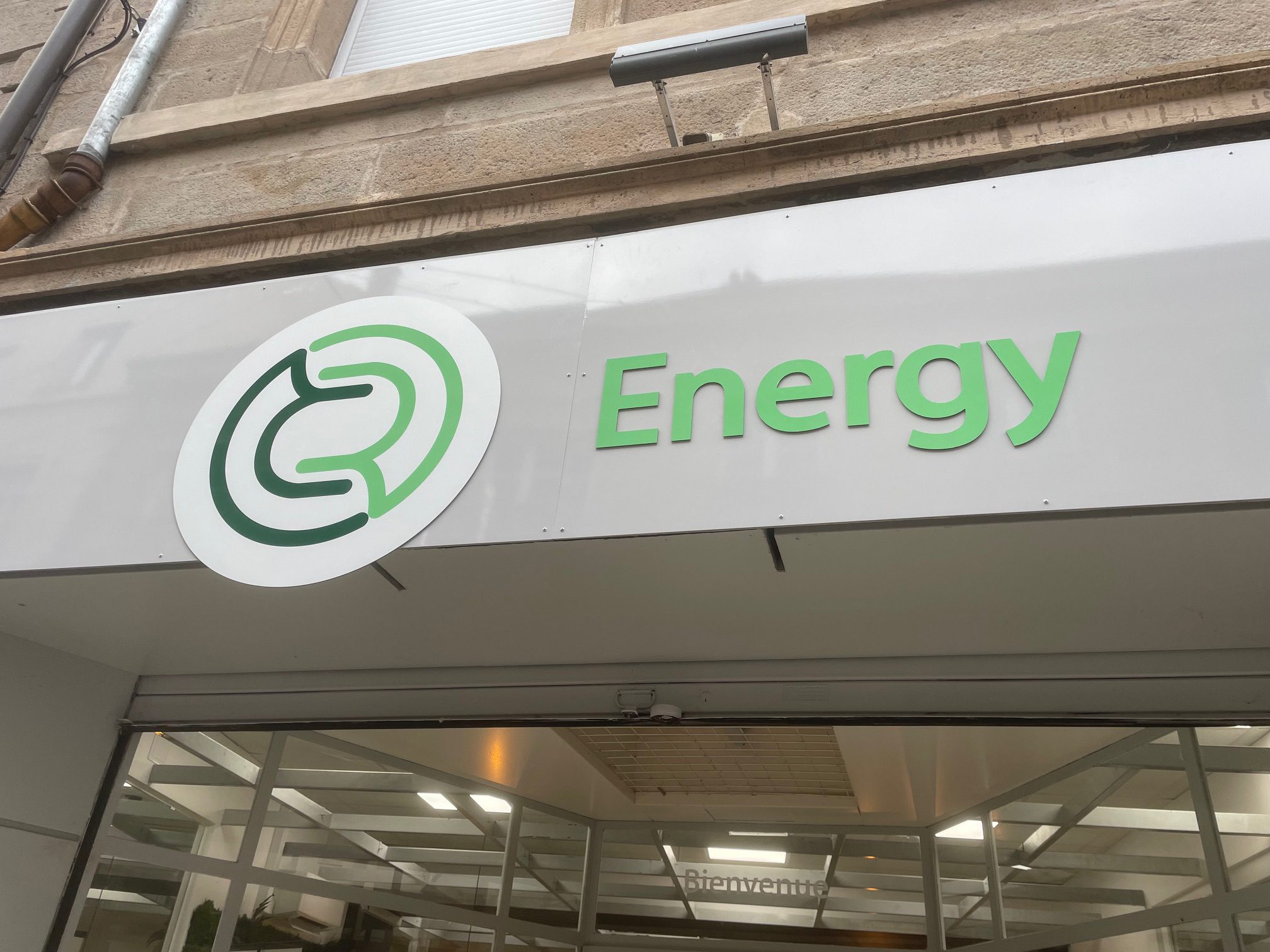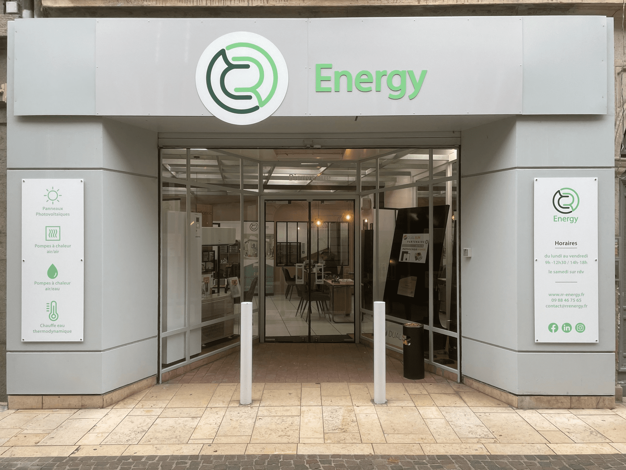 Chaque élément, typographie, couleurs, a été soigneusement étudié pour offrir une lecture fluide et professionnelle, sur les différents supports d'impression mais aussi sur la devanture de leur agence, tout en conservant l'identité de l'entreprise. Une entreprise aux valeurs du renouvelable, de l'énergie, représentée par le cercle et l'environnement par le choix des nuances de vert, choix aussi stratégique pour ancrer l'enseigne dans le territoire stéphanois.